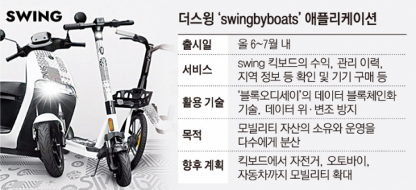 18일 국내 공유 모빌리티 업계에 따르면, 더스윙은 늦어도 내달까지 애플리케이션(앱) ‘swingbyboats’를 출시할 예정이다. 고객들은 이 앱에서 블록체인화된 스윙 모빌리티의 수익, 관리 이력, 지역 정보, 결제 정보 등을 확인해 스윙의 킥보드에 투자할 수 있다.