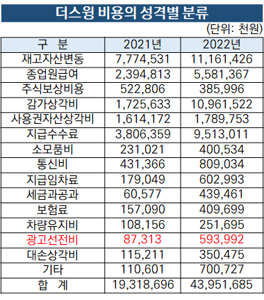 더스윙은 전동 킥보드 기반의 퍼스널 모빌리티 플랫폼을 운영하는 기업이다. 국내 플랫폼 기업은 대부분 전체 비용에서 광고선전비가 차지하는 비중이 큰 편이다. 플랫폼 내 트래픽을 늘리기 위한 선택이다.