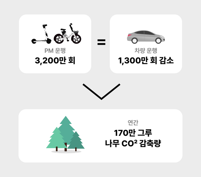 반면, 100% 전기 동력을 기반으로 움직이는 공유 퍼스널 모빌리티의 주행거리당 탄소 발생량은 40g/km 수준으로, 승용차 대비 1/3에도 미치지 못한다. 서울시 기준, 200만 건 이상에 해당하는 단거리 자가용 운행이 전동 킥보드, 자전거 등 PM으로 대체된다면 어느 정도 효과가 있을까?