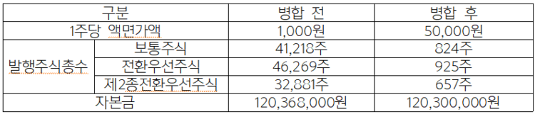 2. 주식병합의 내용: 액면가 1,000원의 보통주 및 전환우선주식 및 제2종전환우선주식 50주를 각각 액면금액 50,000원의 보통주 1주, 전환우선주식 1주, 제2종전환우선주식 1주로 병합