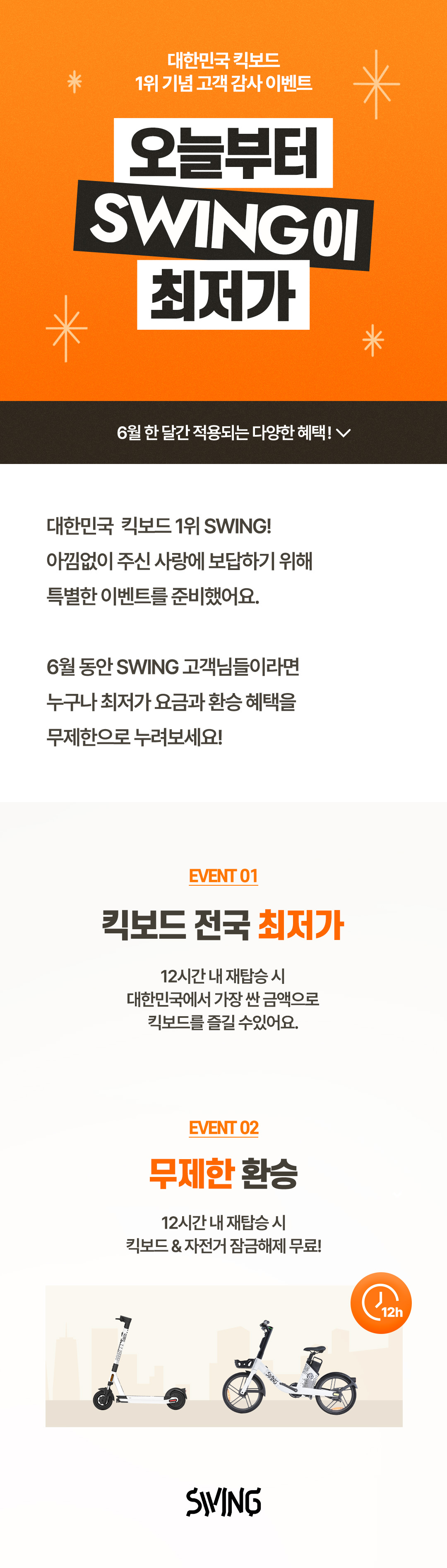 | [EVENT]킥보드 요금으로 스윙 스쿠터 타자, 스쿠터 출시 기념 이벤트 (0) | 2023.05.17 |