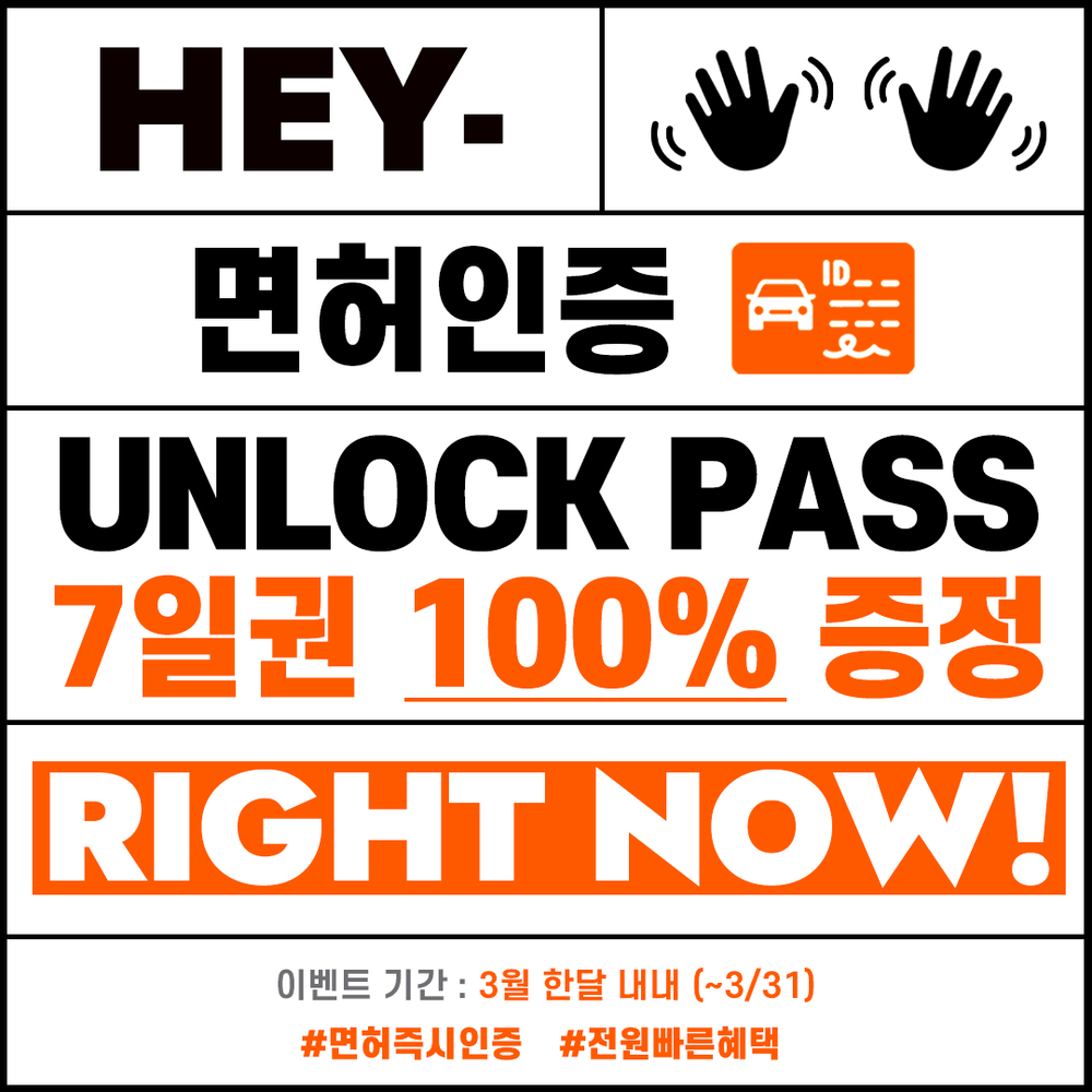 Hey~ 지금 바로 면허인증하면UNLOCK PASS 7일권 100% 전원 증정!